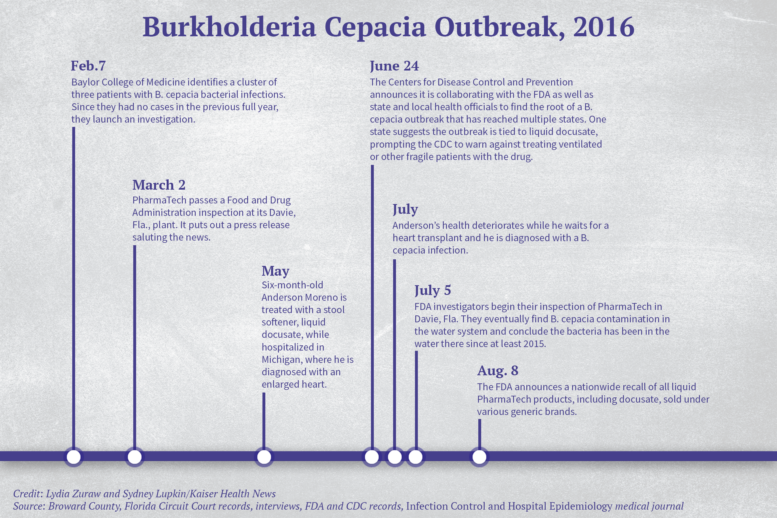 The tainted over-the-counter medicine, docusate sodium, routinely prescribed to nearly every hospitalized patient to avert constipation, caused Anderson to suffer “serious and dangerous life-threatening injuries,” a lawsuit filed by his family alleges. The drug was eventually recalled, but only after a Texas hospital staff noticed an uptick in B. cepacia infections, prompting a six-month investigation that led back to the tainted drug and its Florida manufacturing plant.