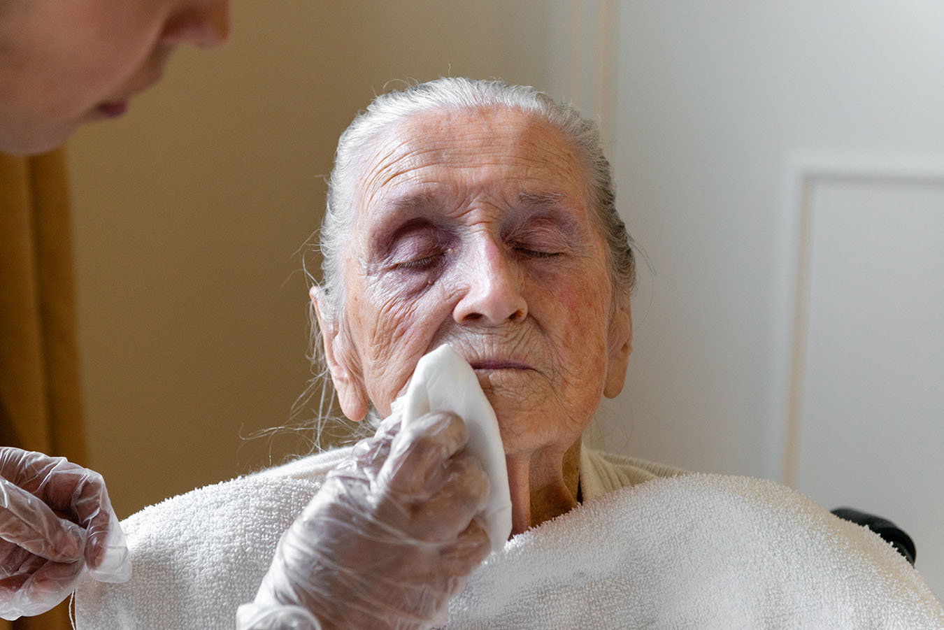 In a nearby room, senior project coordinator Raveena Singh from UC-Irvine talked with Caridad Coca, 71, who had recently arrived at the facility. She explained that Coca would bathe with the chlorhexidine rather than regular soap. “If you have some kind of open wound or cut, it helps protect you from getting an infection,” Singh said. “And we are not just protecting you, one person. We protect everybody in the nursing home.”