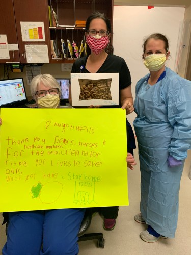 The surrounding community has stepped up — sewing cloth mask protectors and making a big sign outside the hospital that says “HEROES WORK HERE.” Using Facebook, a resident raised thousands of dollars to buy the staff food and snacks.