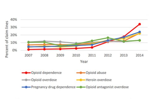 The researchers used de-identified claims data from insurers representing 150 million patients, looking for diagnosis codes related to opioid dependency and abuse, adverse effects of heroin use, and problems caused by the misuse or abuse of other types of opiates. While heroin is a street drug, other opiates are often prescription medications.