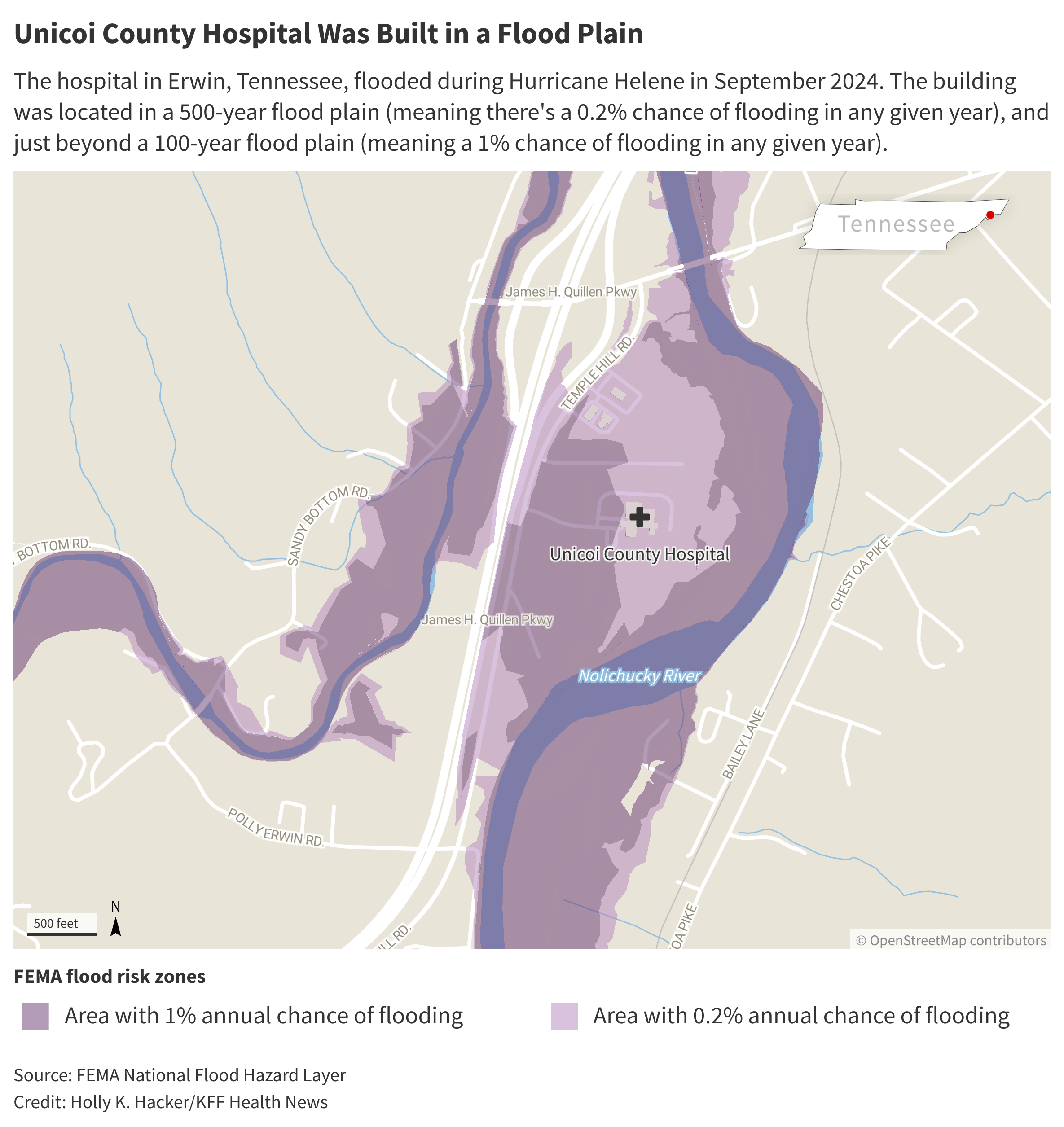 But Unicoi isn’t the only Tennessee hospital built in a flood plain. Eight others across the state were built in moderate- or high-risk flood zones, and a dozen other hospitals are situated just outside them, KFF Health News found.