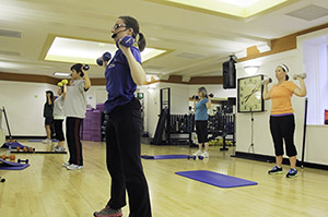 Employees lift weights near the end of a workout class at Sherwin-Williams corporate health and wellness center in downtown Cleveland. (Photo by Sarah Jane Tribble/WPCN – Ideastream)