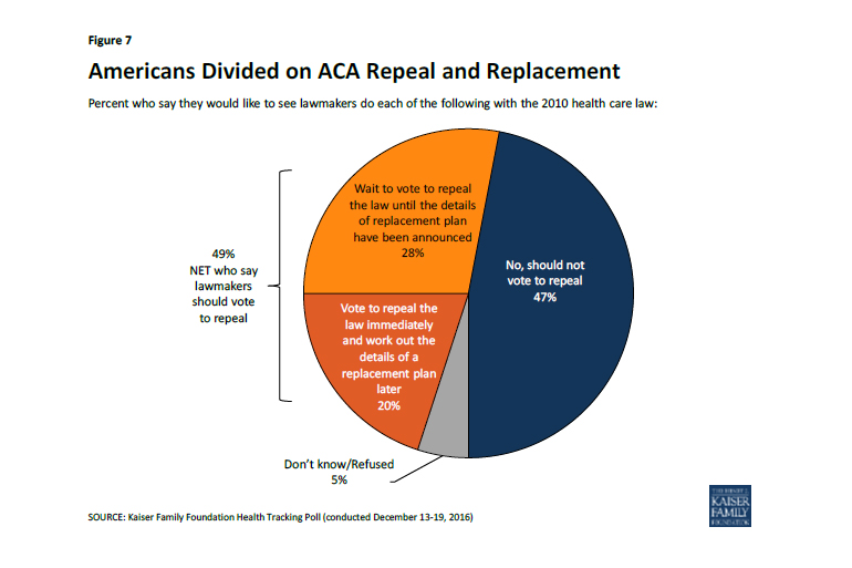 Despite the rout of Democrats in the election, which gave the GOP control of both the White House and Congress, the public’s view on the Affordable Care Act remains as divided as it has been since it was passed by President Barack Obama and congressional Democrats in 2010. Currently, 47 percent of the public wants to keep the law, which upended the way insurers do business and expanded coverage to 20 million Americans.