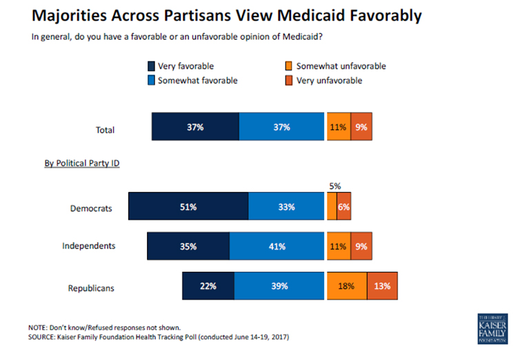 While almost three-fourths of Americans have a favorable view of Medicaid, only about four in 10 — 38 percent — are aware that the House-passed American Health Care Act would make major funding reductions and structural changes to the program. About a fourth of respondents said the bill made “minor reductions” to Medicaid, and 13 percent didn’t realize there were any proposed cuts. (The poll was conducted before the Senate released its legislation on June 22.)