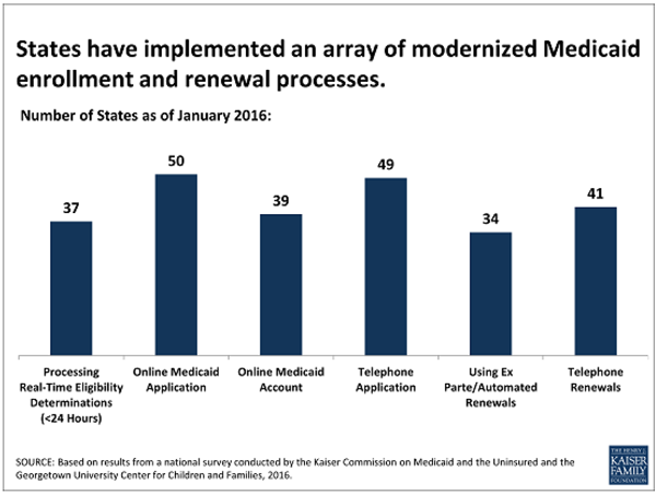 For example, 49 states this year take applications for Medicaid by telephone, up from 15 in 2013, reports the Kaiser Family Foundation. (KHN is an editorially independent program of the Foundation.) All but one state now takes online applications, up from 37 in 2013. Previously, many states often required applicants to complete paper applications or apply in person, leading to weeks of processing time.