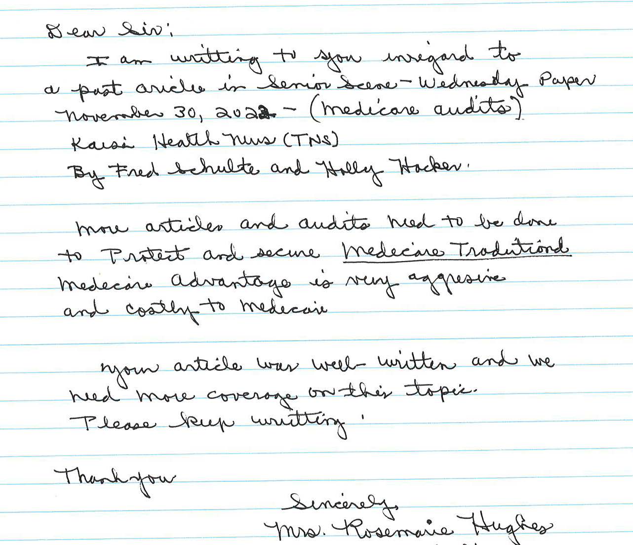 I am writing to you in regard to a past article in the Senior Scene paper (“Audits — Hidden Until Now — Reveal Millions in Medicare Advantage Overcharges,” Nov. 21) about Medicare audits by Fred Schulte and Holly K. Hacker.