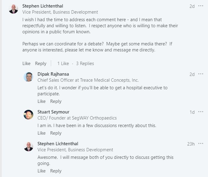 A medical device executive who was mentioned in the story about the $15,076 surgical screws, Steve Lichtenthal, vice president of business development at Orthopaedic Implant Co., based in Reno, Nev., shared the link and received at least 8,300 views. He invited commenters and colleagues on LinkedIn to join in an offline forum. As of Thursday, two had expressed interest.