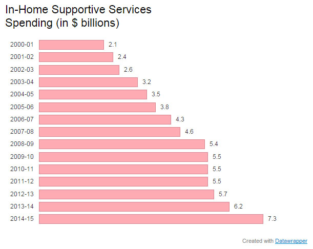 California’s $7.3 billion IHSS program is the largest publicly funded caregiver program in the nation. The caseload has more than doubled since 2001 and now serves about 490,000 low-income clients throughout the state.