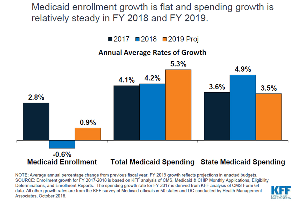 States expect total Medicaid spending growth to accelerate modestly to 5.3 percent in 2019 as enrollment increases by about 1 percent, according to the annual survey of state Medicaid directors.