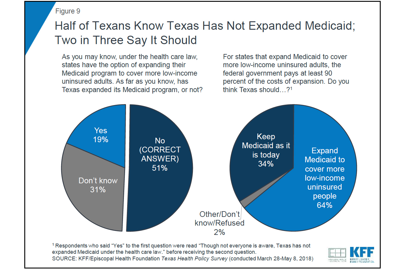 About two-thirds of Texans (64 percent) said they think Texas should expand Medicaid to cover more low-income people. Texas is 1 of the 17 states that have not expanded Medicaid under the Affordable Care Act.