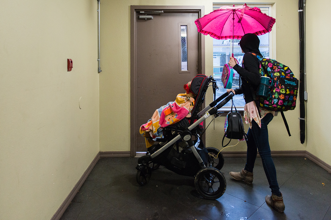 Meagan Holt wheels daughter Maddie outside for a ride to Seattle Children’s Hospital on Nov. 21, 2017. Holt doesn’t drive due to serious vision problems and can’t afford a car. (Heidi de Marco/KHN)