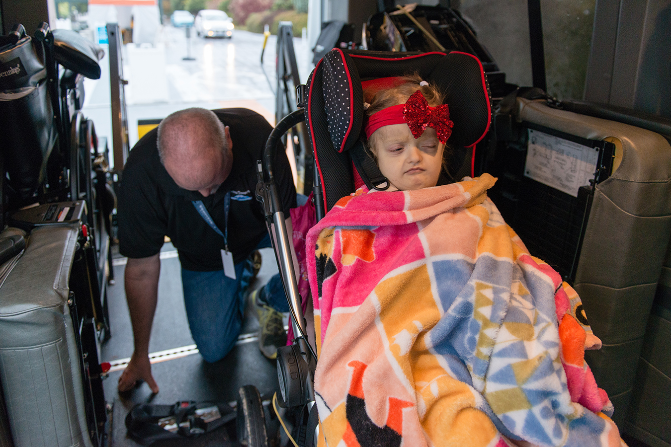 Dunn covers Maddie with her blanket after securing her wheelchair. Dunn says he received special training to transport patients like Maddie, who is loaded onto a motorized platform, wheelchair and all, into the van and then carefully strapped in. (Heidi de Marco/KHN)