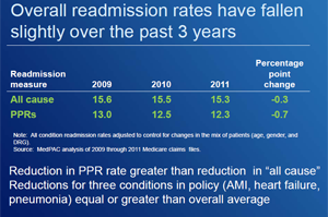 Hospitals have been insisting that they are making strong efforts to reduce the numbers of patients who return, but for the most part there’s been little evidence of dramatic improvements. The MedPAC analysis, however, shows a drop, albeit small. MedPAC calculated that Medicare readmissions within a month of discharge fell 0.7 percent between 2009 and 2011, from 13.0 percent of Medicare patients to 12.3 percent.