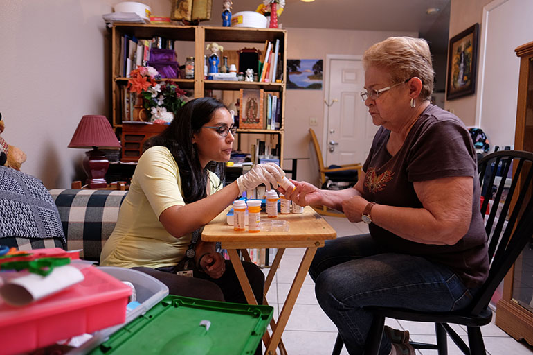 A therapist visits her at home to help organize her medications, which include pills for high blood pressure and cholesterol. The visits are paid for through a Medicaid pilot program, which allows staff to provide extra services for up to five patients who are considered “high utilizers” of health care, or patients who are particularly costly to insurers because of repeat trips to the hospital or ER, said Megan Fredrick, the clinic’s program manager.