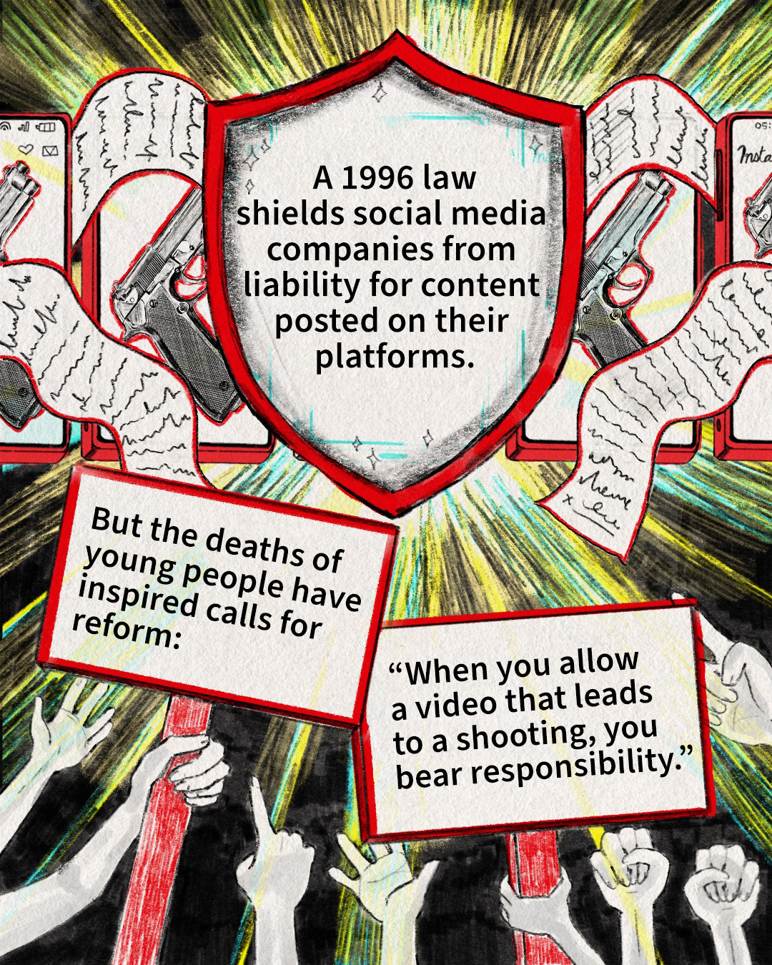 This illustrated report has been adapted from a KFF Health News article, “‘All We Want Is Revenge’: How Social Media Fuels Gun Violence Among Teens,” by Liz Szabo.