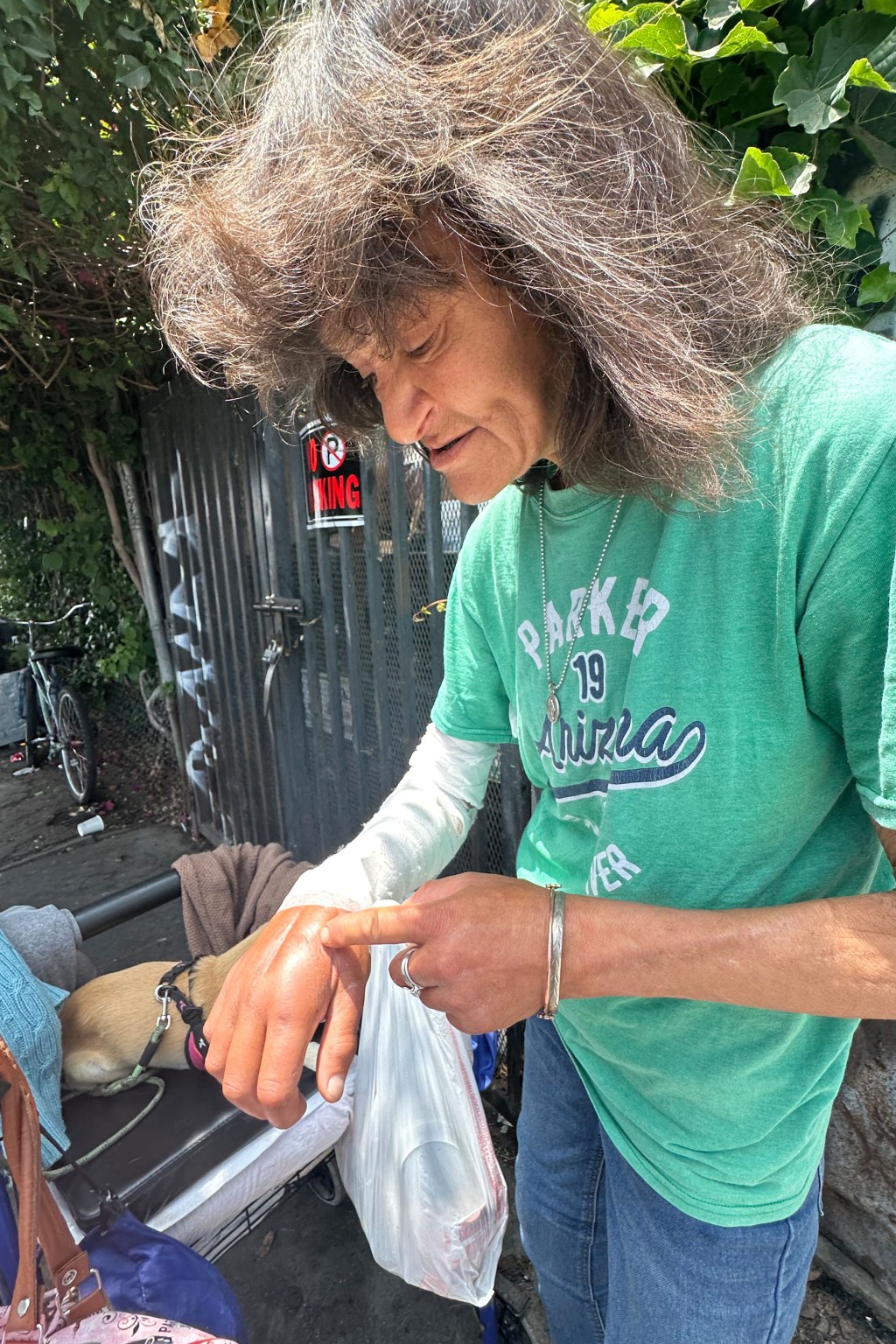 Just outside the Skid Row Care Campus, Cindy Ashley organized her belongings in a cart after recently leaving a local hospital ER for a deep skin infection on her hand and arm caused by shooting heroin. She also regularly smokes crack, she said.