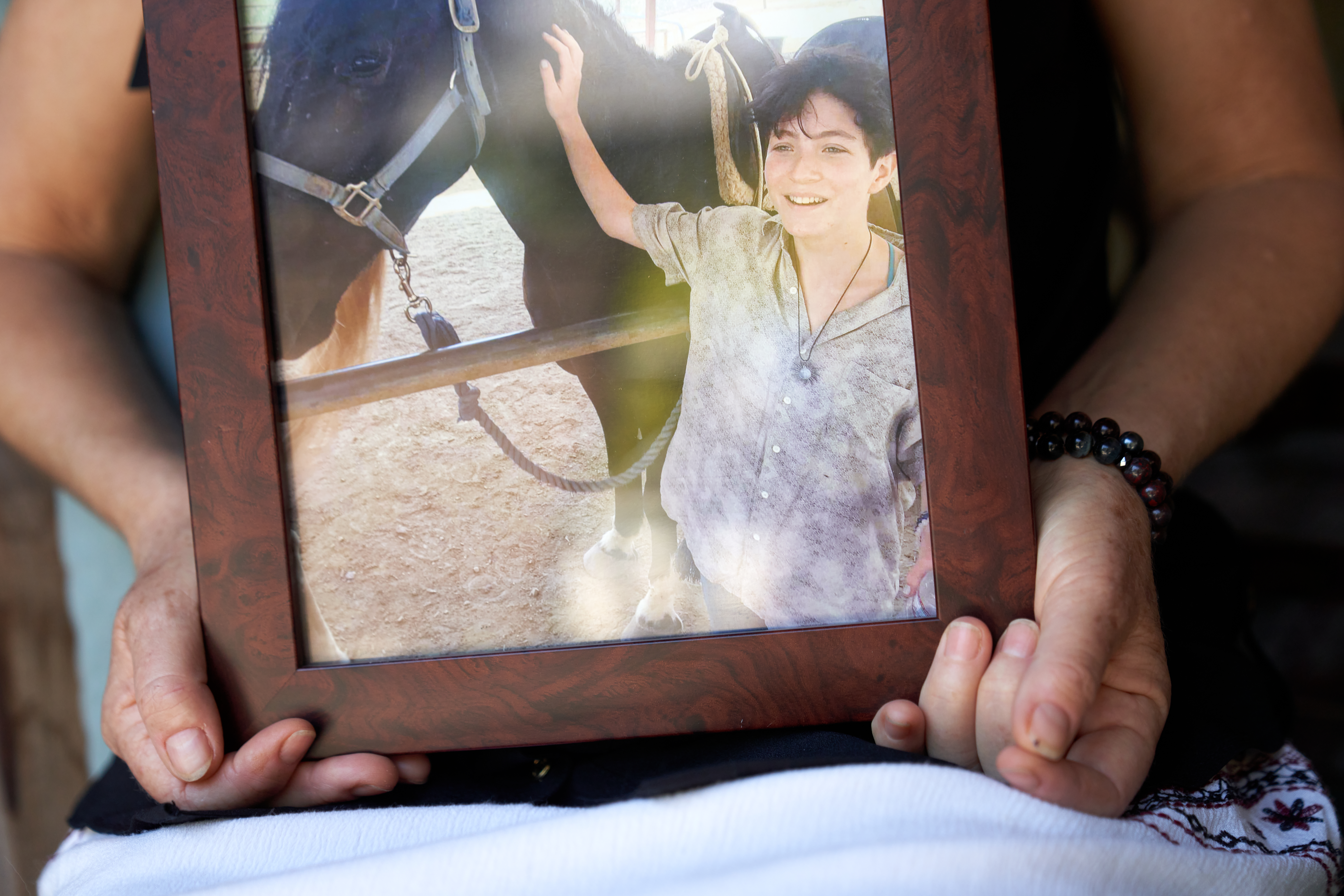 Deborah Blum holds a photo of her teen, Esther Iris, at home in Los Angeles. Blum and her husband, Warren, lost Esther Iris to suicide in 2021. When it came time to write the death notice, Deborah Blum was open and specific about the mental health struggles that led to her child’s death. (Lauren Justice for KFF Health News)