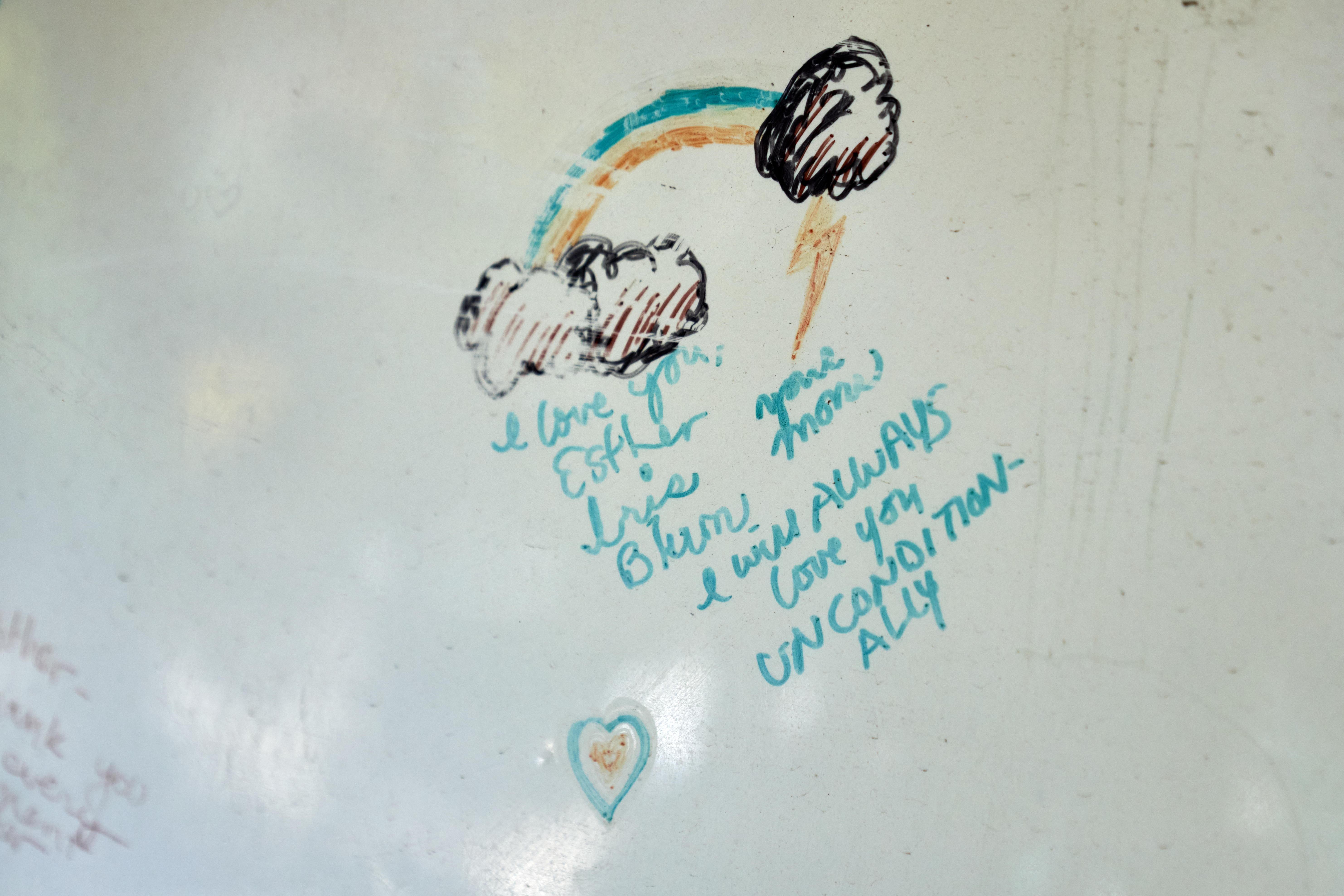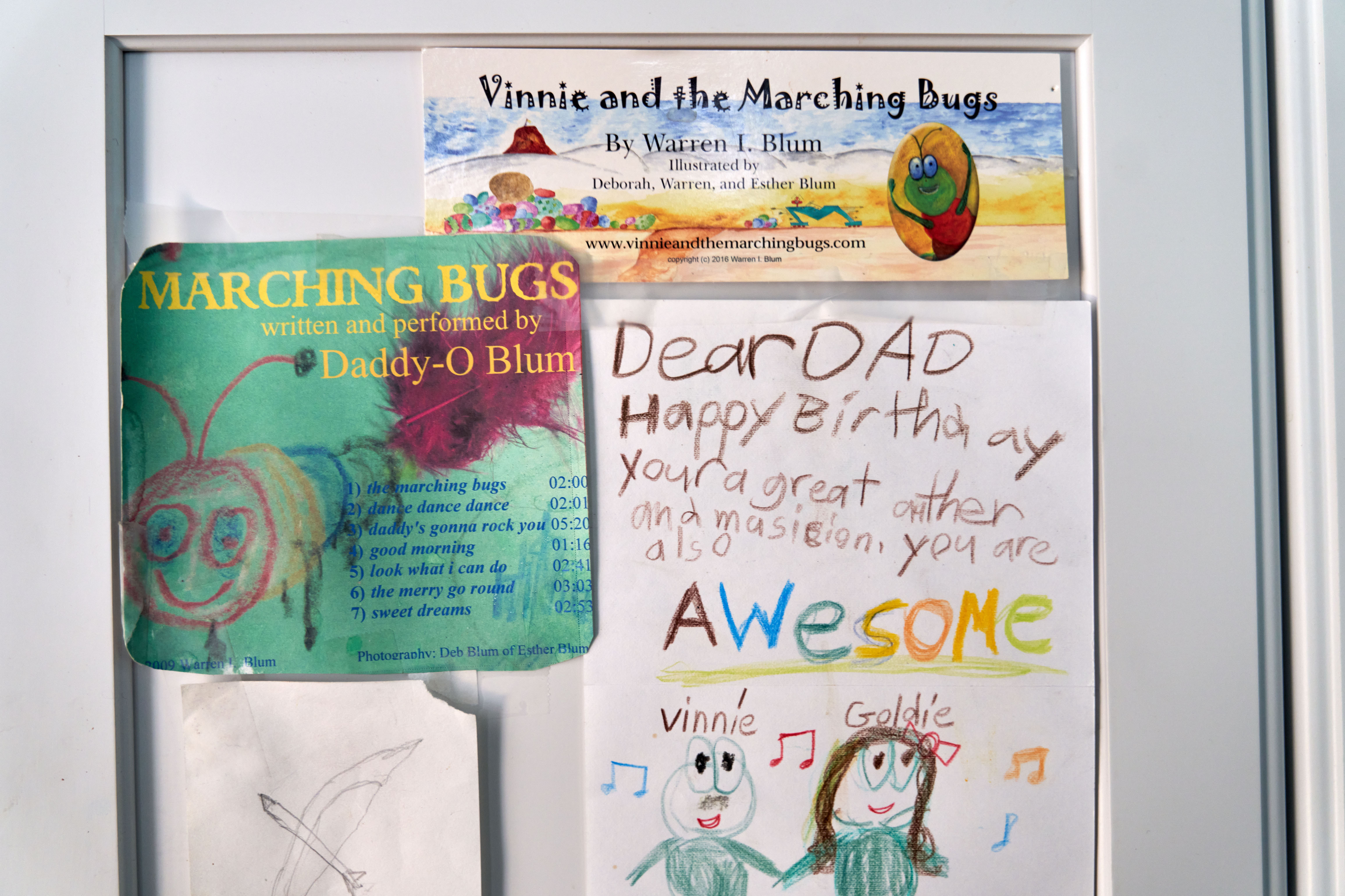 A card Esther Iris Blum made for their dad hangs on the wall at their home in Los Angeles. (Lauren Justice for KFF Health News)