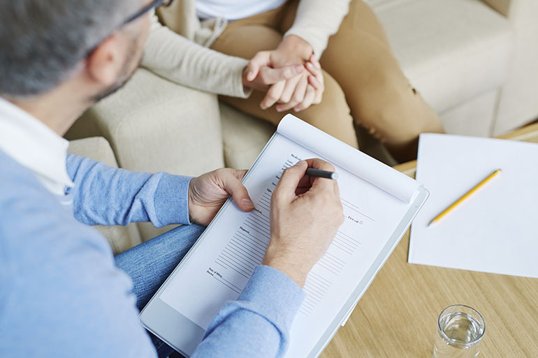 Psychologist talking to depressed woman in the office