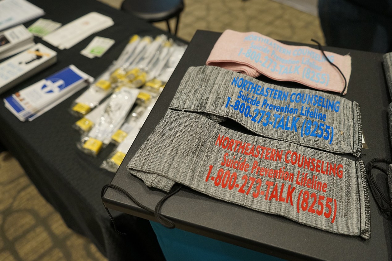 This was the first time Hatch and her colleagues at Northeastern Counseling did outreach at a gun show. As the auditorium filled with firearm sellers and hunters, the counselors stacked their folding tables with neat piles of free cable locks that thread into a gun to prevent rounds from being loaded, and water-resistant gun socks screen-printed with the National Suicide Prevention Lifeline number.