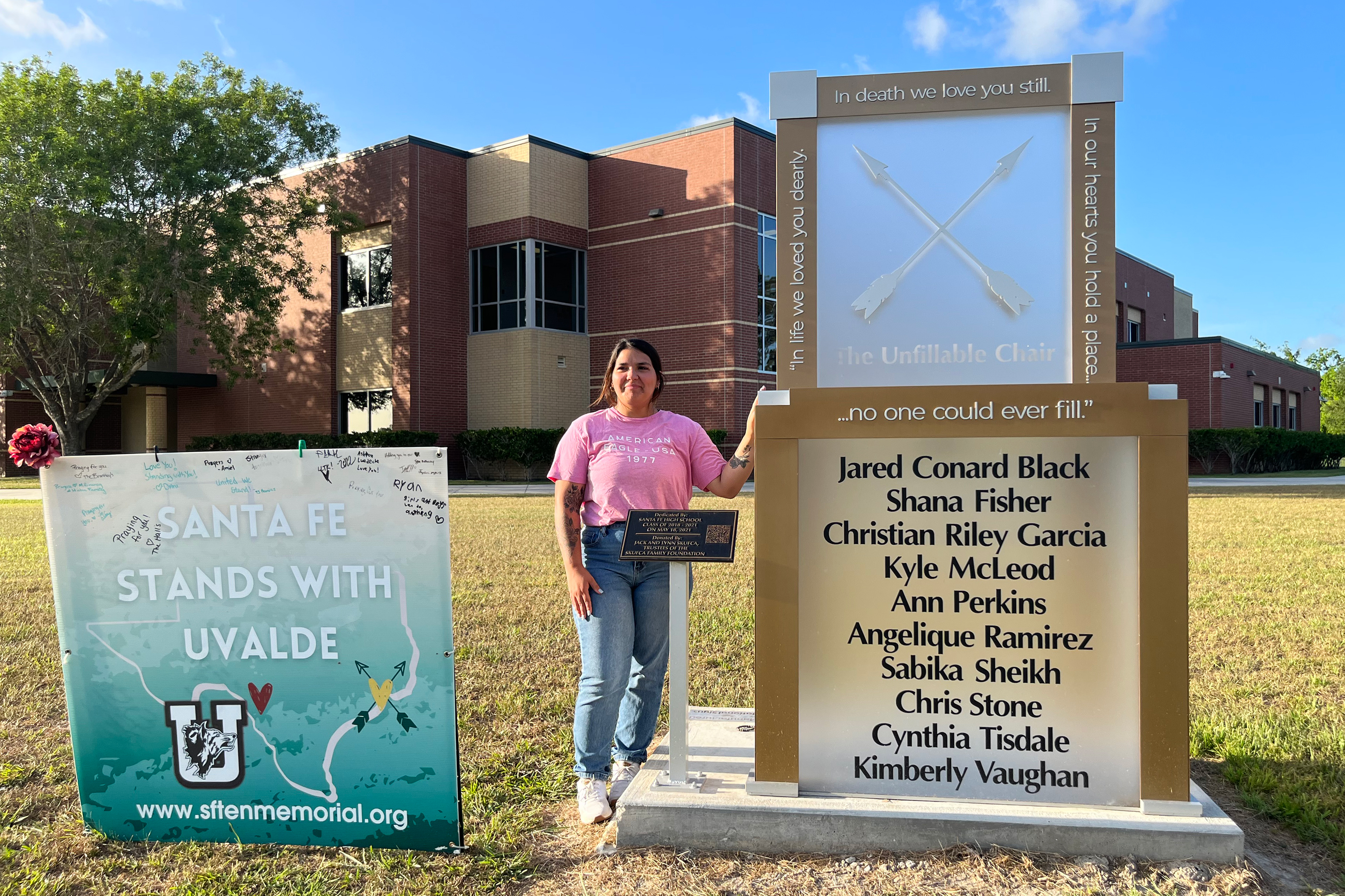The Santa Fe community is torn between forgetting and grieving. Memorials to the eight students and two teachers killed dot this city. An 8-foot-tall empty aluminum chair stands in front of the high school. Ten white crosses are planted in the grass next to the Maranatha Christian Center. Green-and-black benches made from recycled plastic lids sit at the library and the therapeutic garden behind City Hall.
