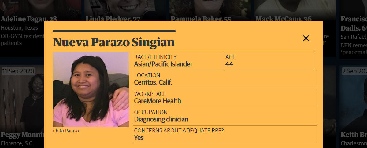 Nueva Parazo was a nurse practitioner in Southern California and one of scores of health care workers from the Philippines who have died of covid-19. Her father, Chito Parazo, described her as a skilled and compassionate nurse and doting daughter. She died on Sept. 5, 2020.