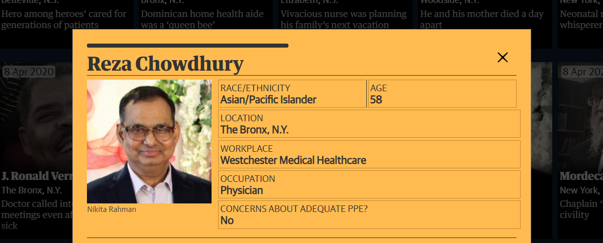 Dr. Reza Chowdhury was a beloved internist with a private practice in the Bronx and a trusted voice in New York’s Bengali community. His daughter, Nikita Rahman, said that despite underlying health issues putting him at higher risk of developing covid complications, he saw patients through mid-March last year, when he developed symptoms. He died on April 9, 2020.