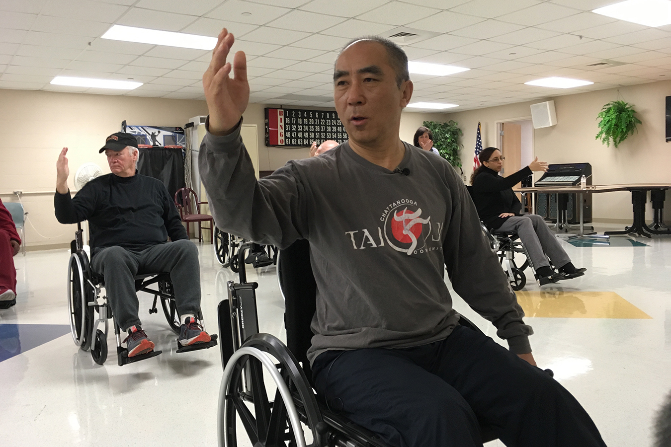 The participants swivel about-face and continue to the next pose. Guo modified the ancient Chinese martial art to work from a seated position. Even though many of those in his class don’t rely on wheelchairs for mobility, using the mobile chairs makes it easier for them to get through a half-hour of movement.