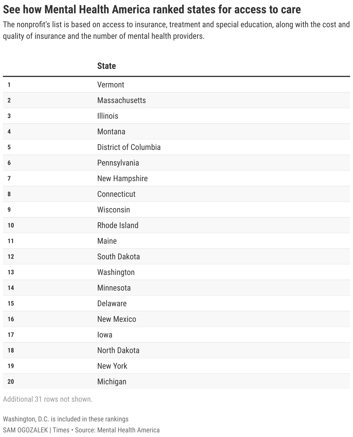 Last year, the national advocacy group Mental Health America said Florida ranked 46th among the 50 states and the District of Columbia for access to such care. Arizona, Kansas, Georgia, Alabama, and Texas were worse off, according to the nonprofit, which based its rankings on access to insurance, treatment, and special education, along with the cost and quality of insurance and the number of mental health providers.