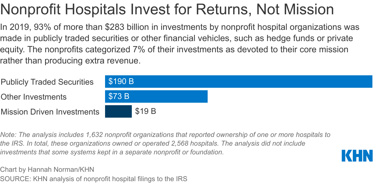 Though their tax-exempt status is predicated on charitable efforts, nonprofit health systems rarely put humanitarian goals first when selecting investments, even when sitting on portfolios worth hundreds of millions of dollars or more, according to a KHN analysis of IRS filings. Together, nonprofit hospital systems held more than $283 billion in stocks, hedge funds, private equity, venture funds and other investment assets in 2019, the analysis found. Of that, nonprofit hospitals classified only $19 billion, or 7%, of their total investments as principally devoted to their nonprofit missions rather than producing income, the KHN analysis found.