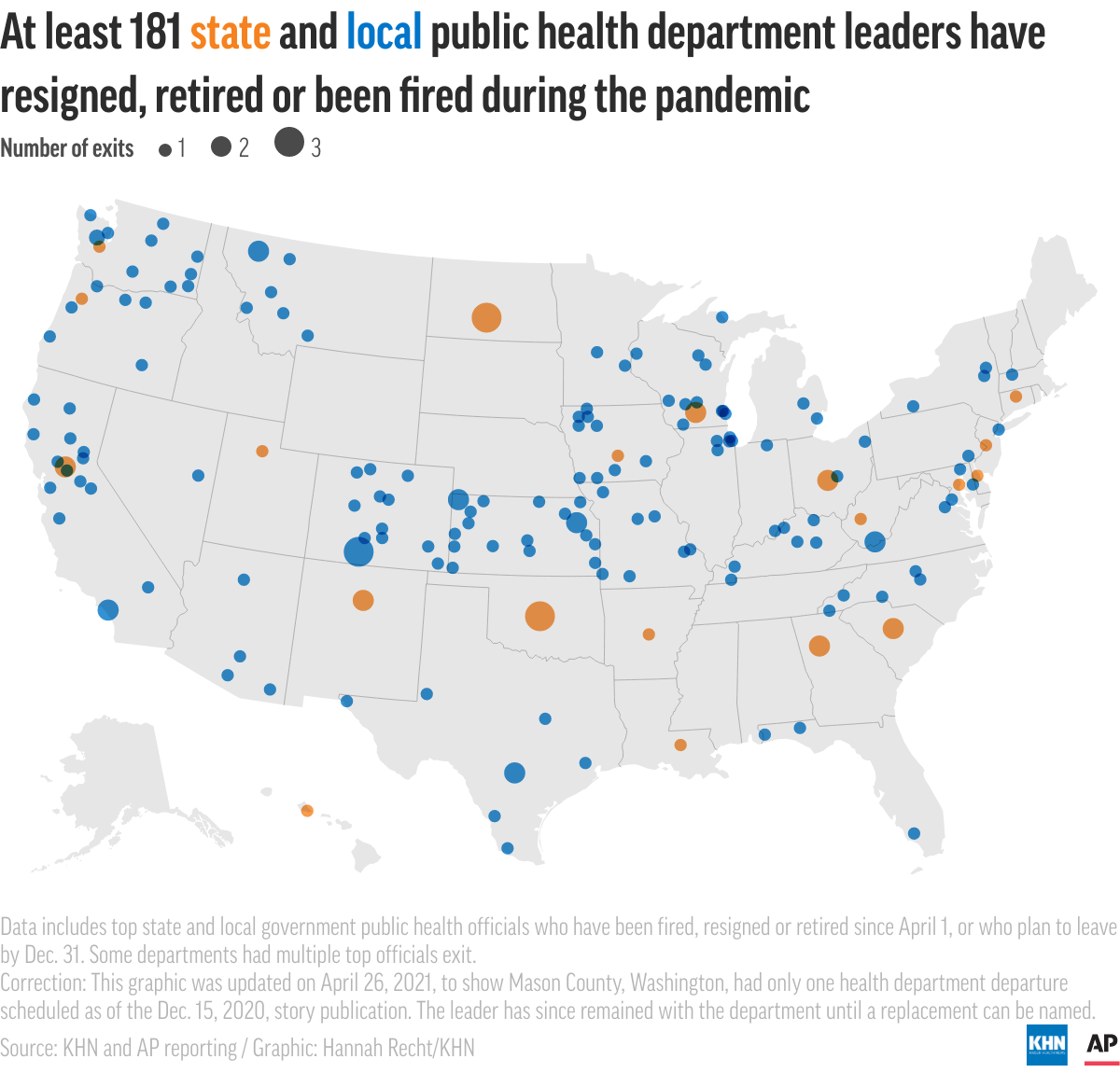 It is a further erosion of the nation’s already fragile public health infrastructure. At least 181 state and local public health leaders in 38 states have resigned, retired or been fired since April 1, according to an ongoing investigation by The Associated Press and KHN. According to experts, this is the largest exodus of public health leaders in American history. An untold number of lower-level staffers has also left.