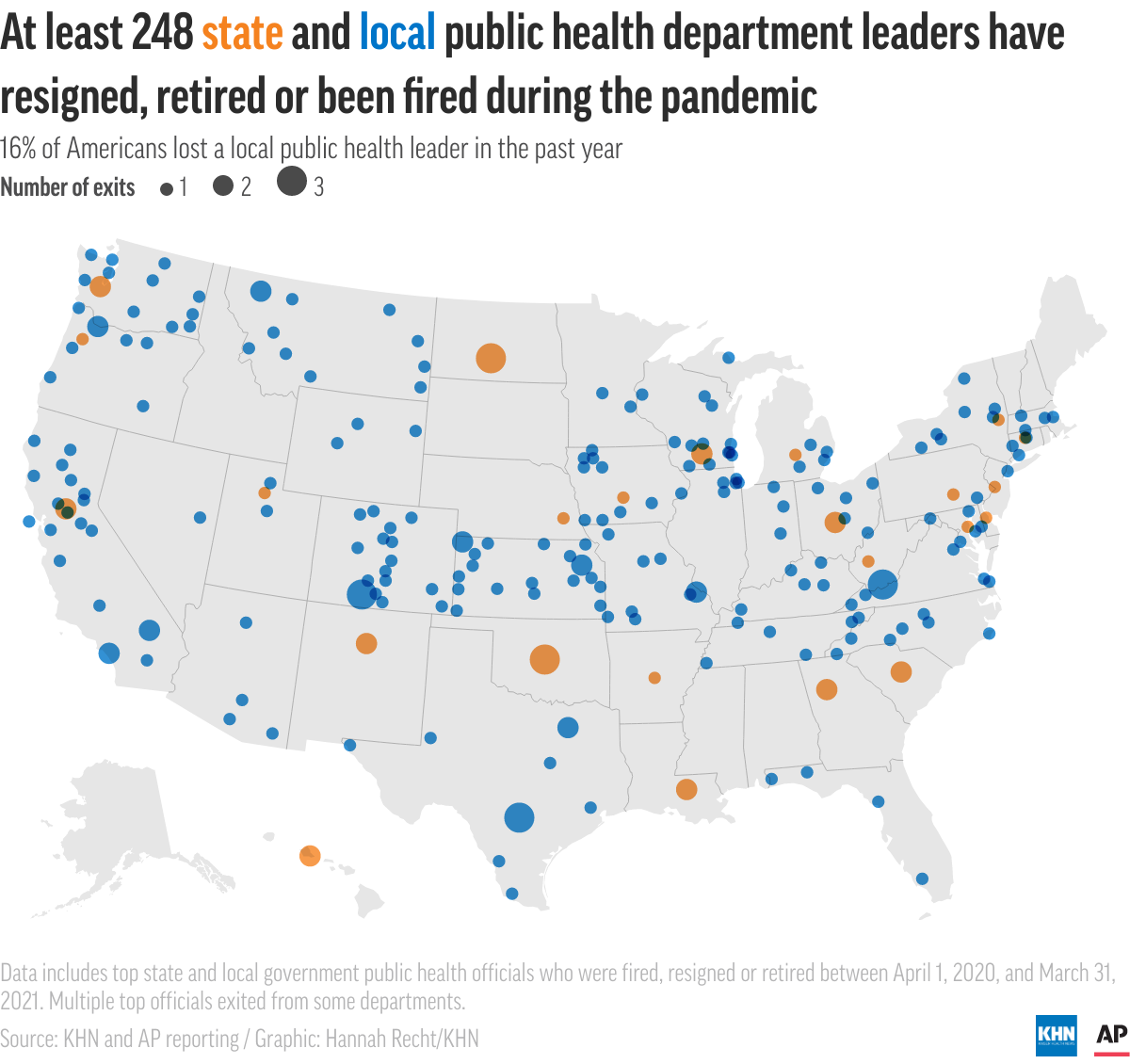 Compounding those losses, the pandemic has prompted an exodus of public health officials because of harassment, political pressure and exhaustion. A yearlong analysis by the AP and KHN found at least 248 leaders of state and local health departments resigned, retired or were fired between April 1, 2020, and March 31, 2021. Nearly 1 in 6 Americans lost a local public health leader during the pandemic. Experts say it is the largest exodus of public health leaders in American history.