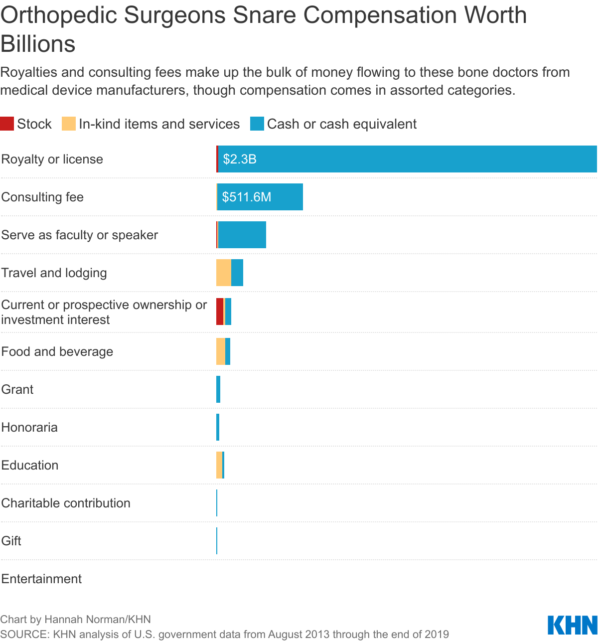 Every year, a torrent of cash and other compensation flows to these surgeons from manufacturers of hardware for spinal implants, artificial knees and hip joints — totaling more than $3.1 billion from August 2013 through the end of 2019, a KHN analysis of government data found. These bone specialists make up a quarter of U.S. doctors who have accepted at least $100,000 or more, and two-thirds of those who raked in $1 million or more, from the medical device and drug industries last year, the data shows.