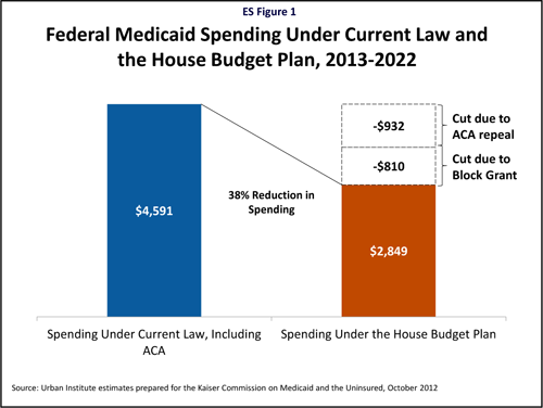 The House Republican plan to repeal President Barack Obama’s health law and turn Medicaid into a block grant program would save the federal government $1.7 trillion from 2013 to 2022, a 38-percent spending reduction, according to a report today by the Urban Institute for the Kaiser Family Foundation.