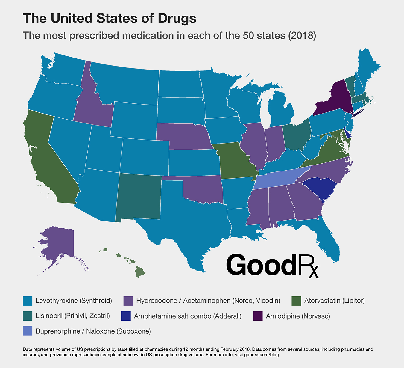 The company looked at the top 10 drugs prescribed in each state from March 2017 to February 2018 and then presented the data as a map.