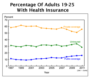 Officials based their number on U.S. Census data and the results of the latest National Health Interview Survey. In September 2010, the survey found 64.4 percent of adults between 19 and 25 were insured. By March, the rate was up to 69.6 percent, and in June it was at 72.7 percent. That month, the uninsured rate for this population reached its lowest point in more than a decade, down to 28.8 percent.