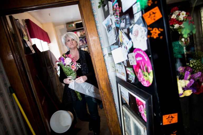 Tara Parsons, 42, prepares flowers for a customer. Parsons, who runs the Touch of Country Floral and Gifts shop in Arco, also serves as the town’s coroner and volunteer EMT. (M. Scott Mahaskey/Politico)