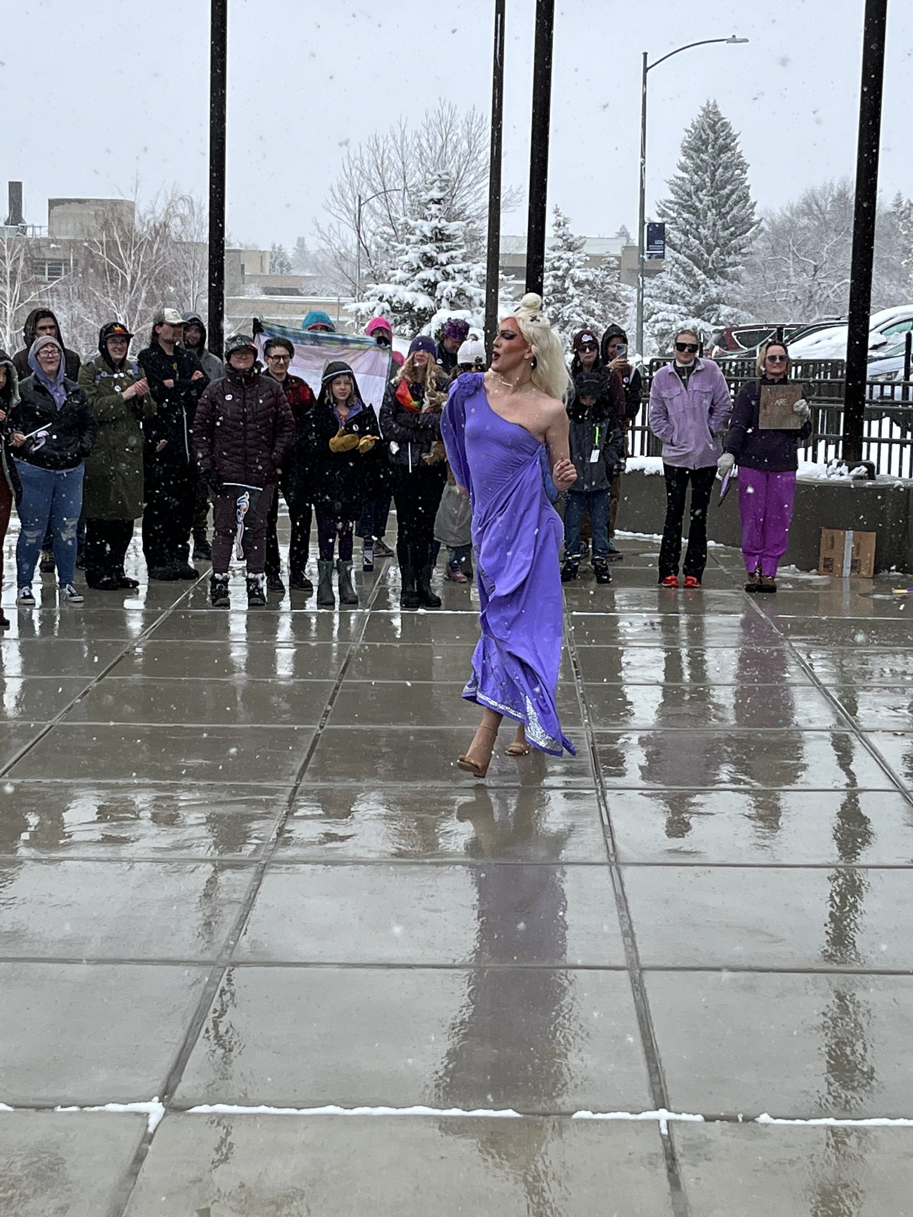About an hour after the hearing, people gathered outside the Capitol in an April snowstorm for a drag show.