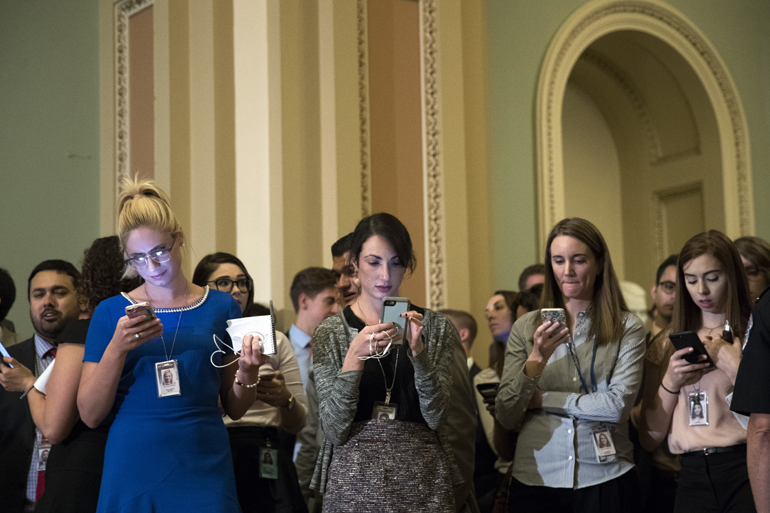 Reporters’ heads swiveled toward the doors each time they opened, and when they weren’t doing that, they split their attention between watching the Senate floor action live-streamed on their phones and what they could glimpse through the chamber’s doors a few feet away.