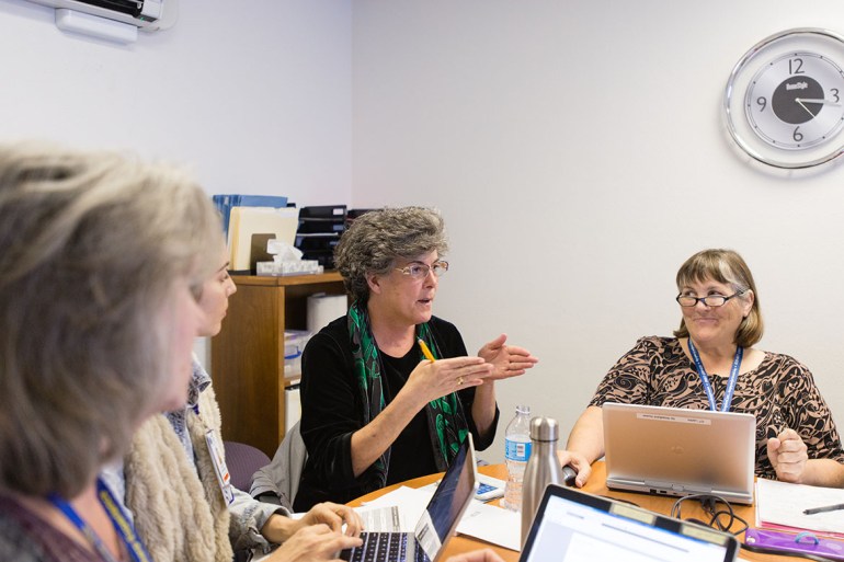 Doctors, nurses and social workers gather in a small conference room for their bimonthly meeting to discuss patient cases for the Sharp HealthCare Transitions program in January. (Heidi de Marco/KHN)