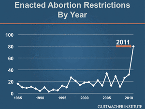According to the report, the 80 new abortion restrictions already in 2011 are more than double the previous annual record of 34 seen in 2005, and more than triple 2010’s 23 changes.