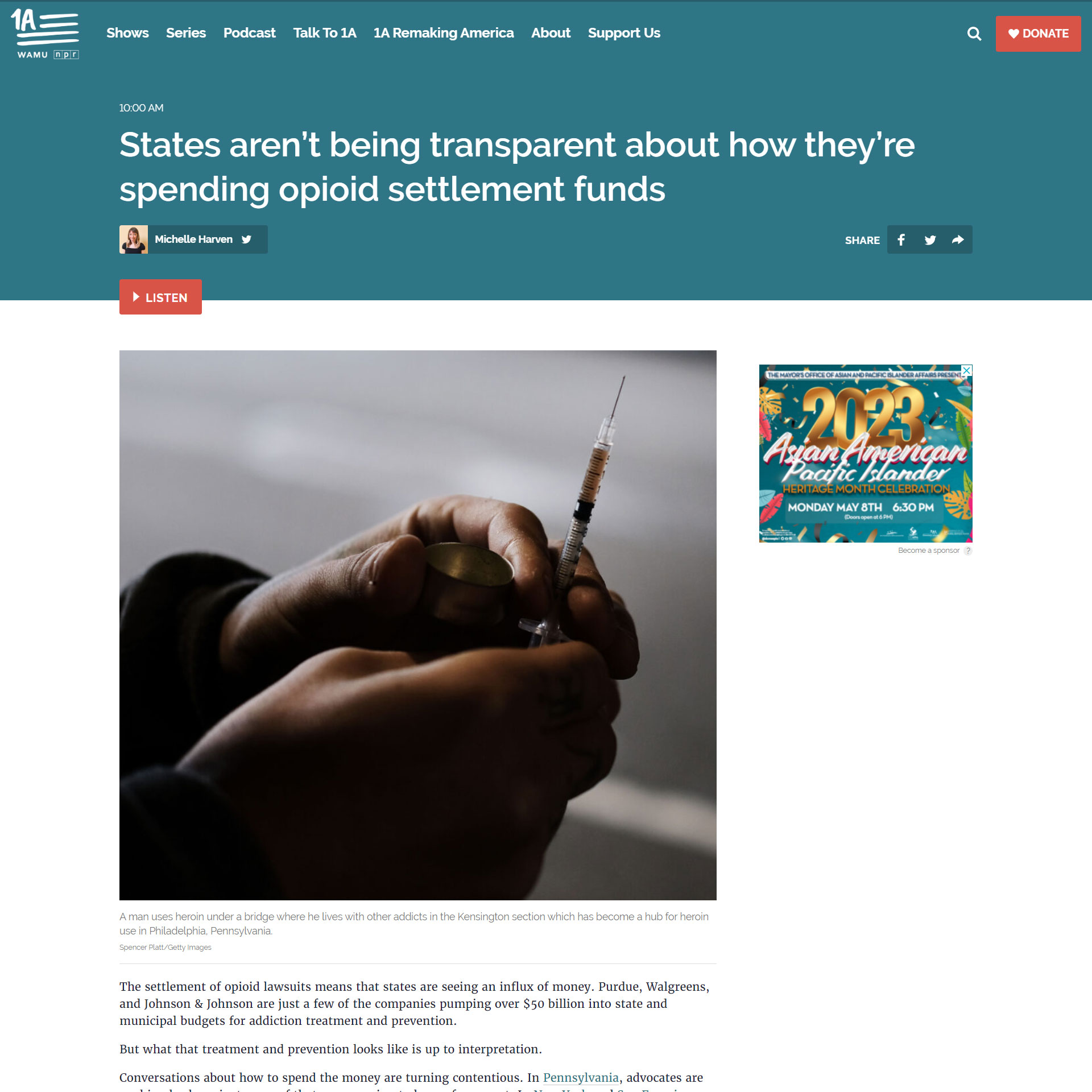KFF Health News senior correspondent Aneri Pattani appeared on NPR’s “1A” on May 1 to discuss these critical issues and what people need to know to hold their governments accountable. She was joined by three people featured in her previous reporting: Jackie Lewis, a mother and grandmother personally affected by the opioid epidemic; Christine Minhee, founder of OpioidSettlementTracker.com; and Cara Poland, an addiction medicine doctor and chair of Michigan’s Opioid Advisory Commission.