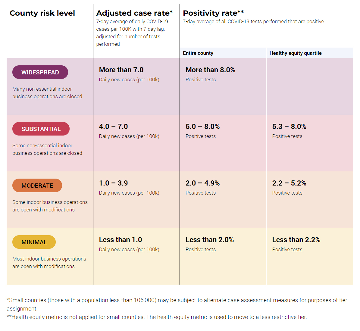 Even as it frustrates some residents, California’s tiered reopening system has won praise nationally. The system draws on three COVID metrics to guide restrictions: new cases per population; the share of people tested for the coronavirus who are positive; and, in larger counties, an equity measure to ensure cases are low across the county, including in high-risk communities. Under revised guidelines released this week, county tier assignments can change from week to week — and more than once a week if data indicates a county is losing ground.
