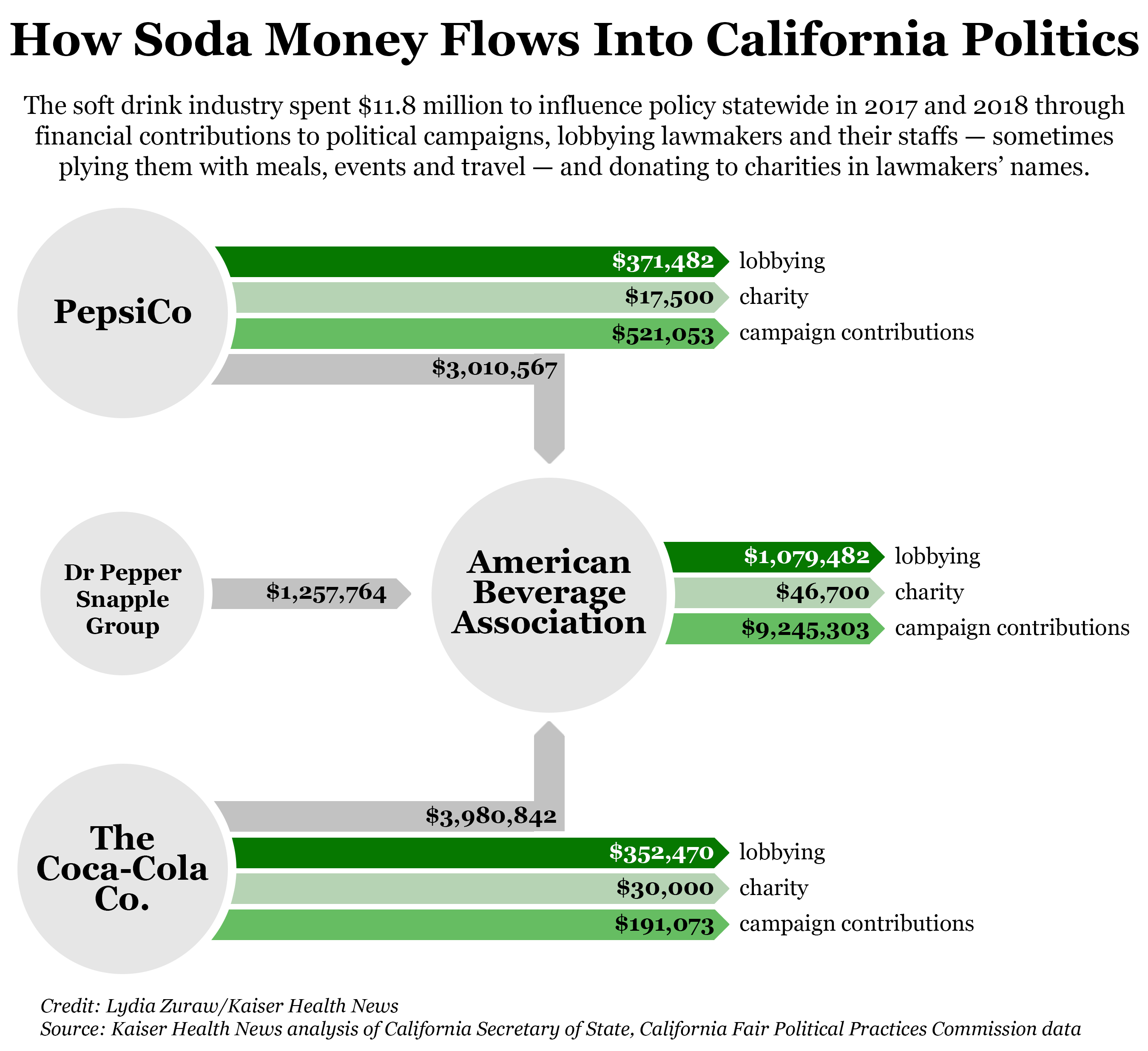 A California Healthline analysis found that 9 in 10 state senators and members of the Assembly, or a member of their staff, accepted a campaign contribution, gift or charitable donation in 2017 and 2018 from the American Beverage Association (or its political action committee), the Coca-Cola Co. or PepsiCo — the three largest givers in the industry.