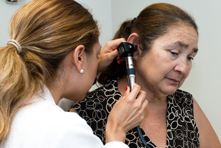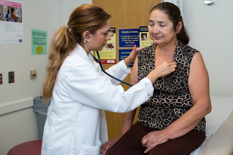 Vargas checks Sanchez for an irregular heart beat. The 54-year-old has been experiencing chest pain (Photo by Heidi de Marco/KHN).