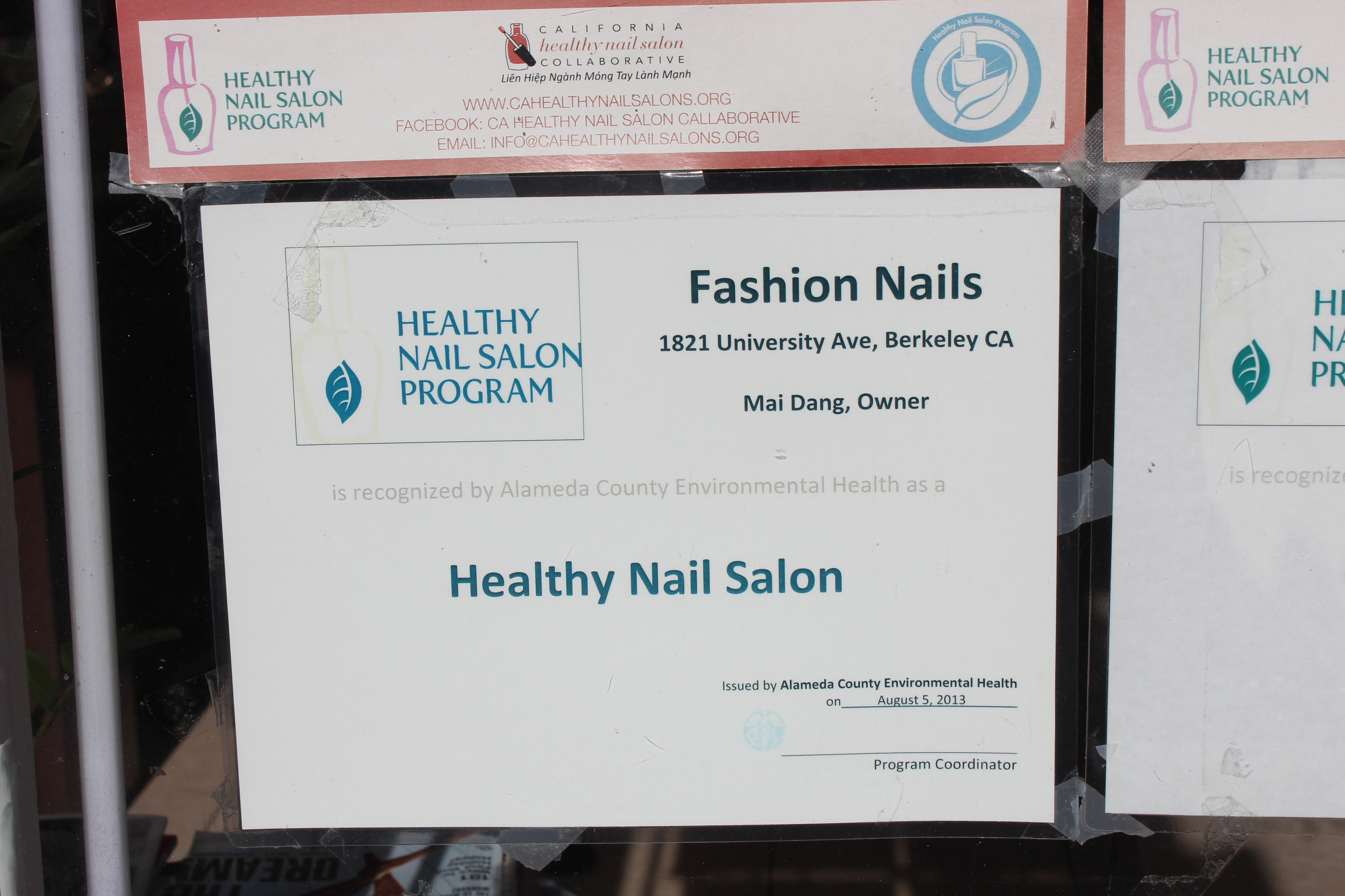 Alameda County certified Dang’s salon, Fashion Nails, as a healthy salon in 2013, based on her changes. In return, Dang got a certificate that she hangs in her window to let customers know she is part of the collaborative. Fashion Nails is also listed as a healthier nail salon on a government website.