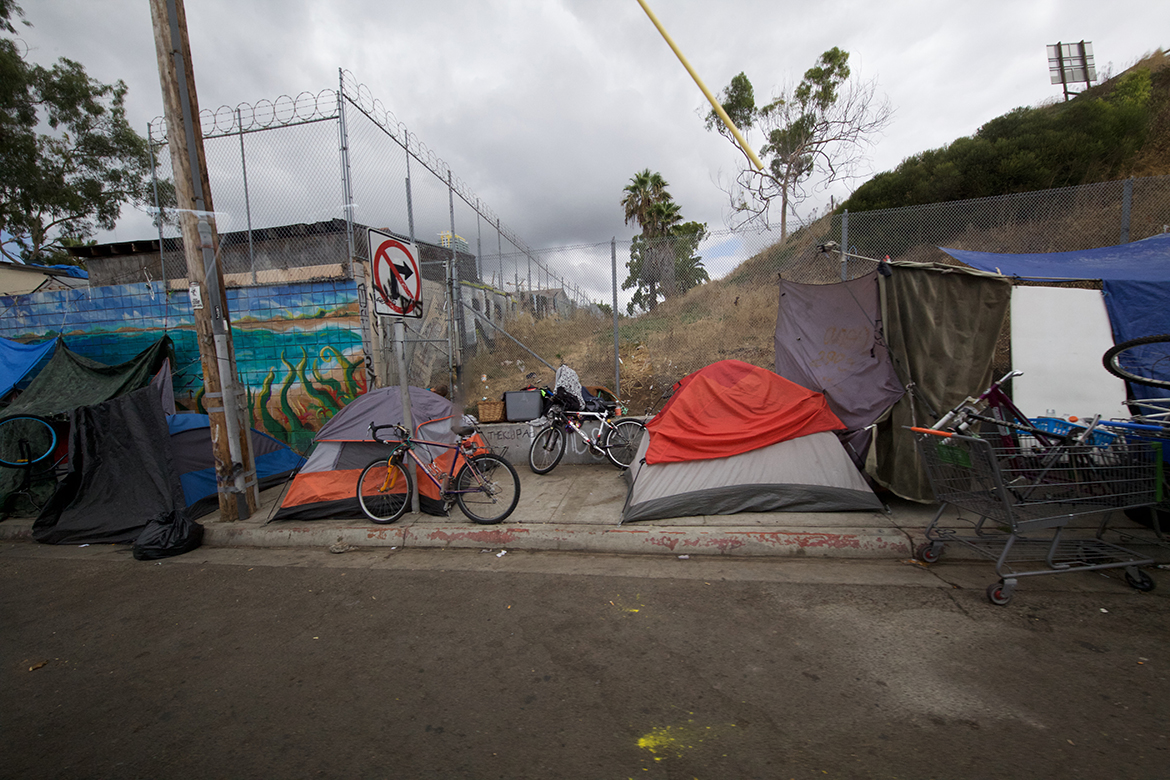 “It looks like a war zone,” said Larissa Wimberly, an outreach supervisor for Alpha Project. “There’s people out here with HIV, people out here with cancer, there’s people out here with heart issues. There are people who are just old and feeble and they’re not eating right. It’s really sad.”