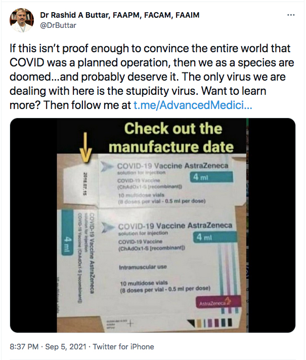 Earlier this month, Dr. Rashid Buttar posted on Twitter that covid-19 “was a planned operation” and shared an article alleging that most people who got the covid vaccine would be dead by 2025.