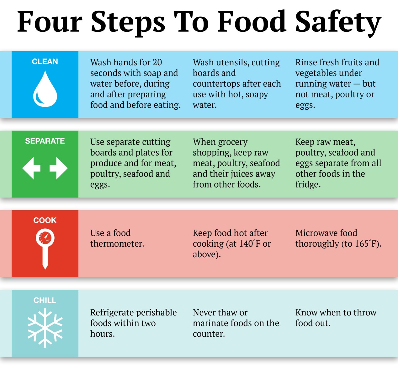 Two other steps in safe food handling — separation and cleaning — help prevent cross-contamination.