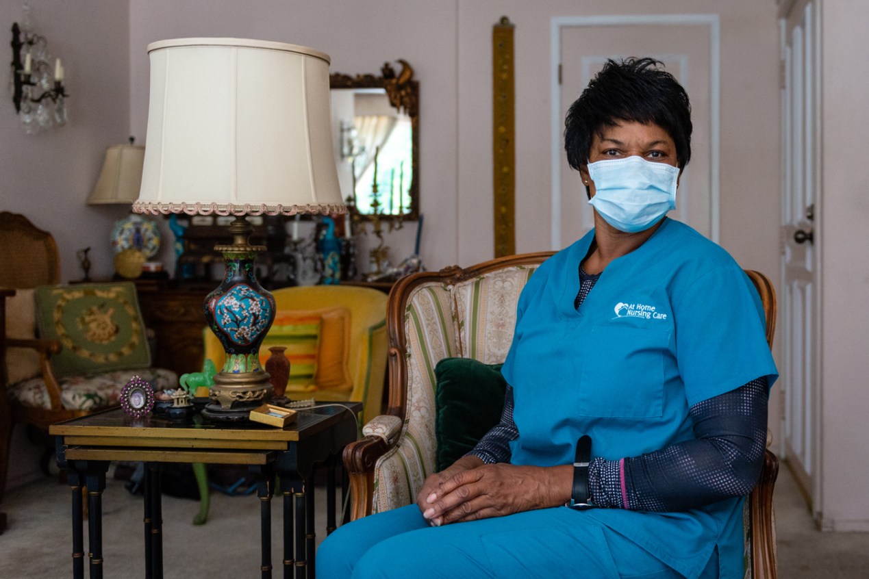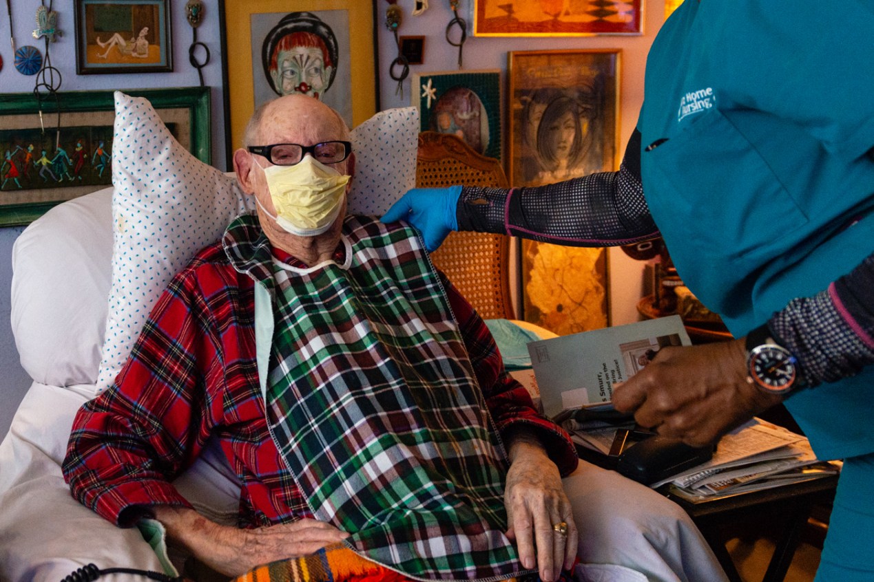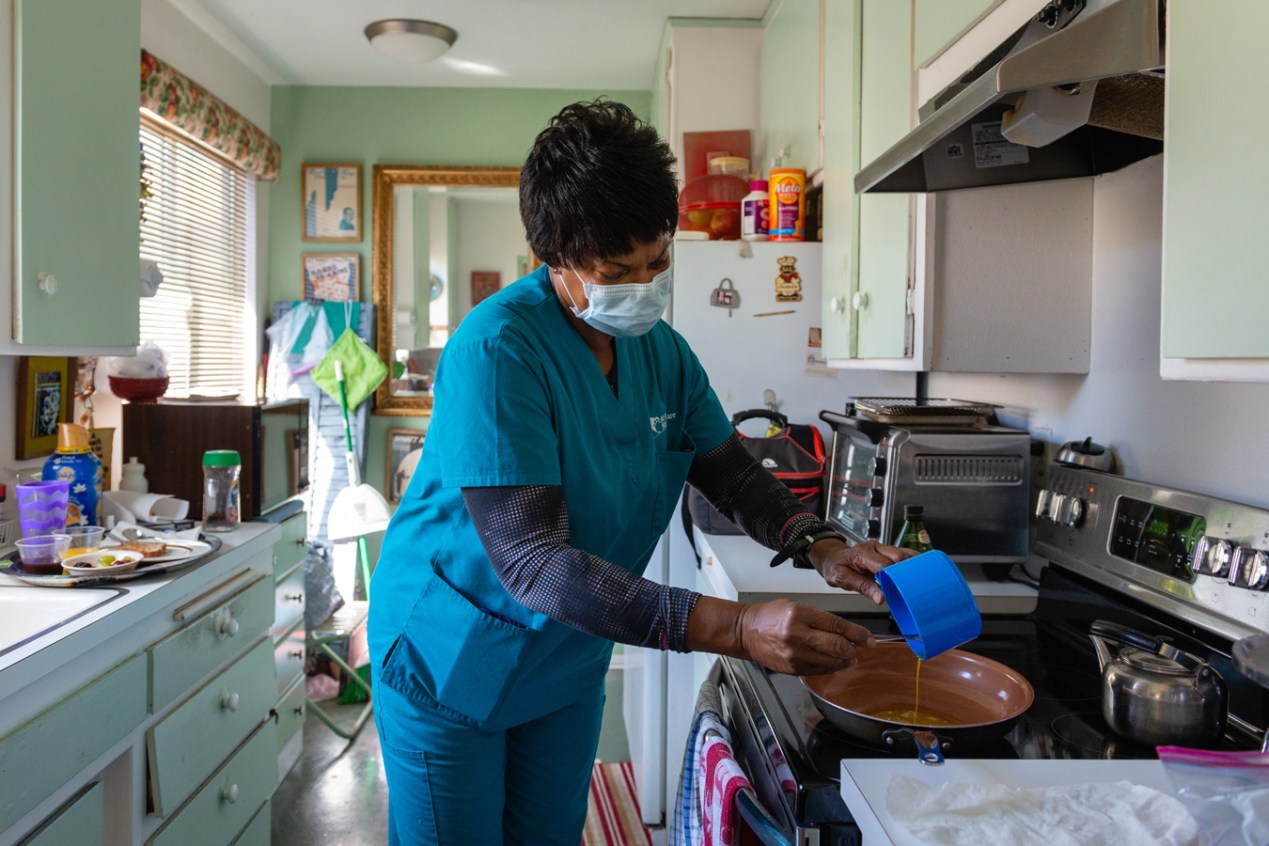 Yet, three days a week, she spends 16 hours with someone at even greater risk: a 97-year-old man who depends on her and two other home health aides to survive.